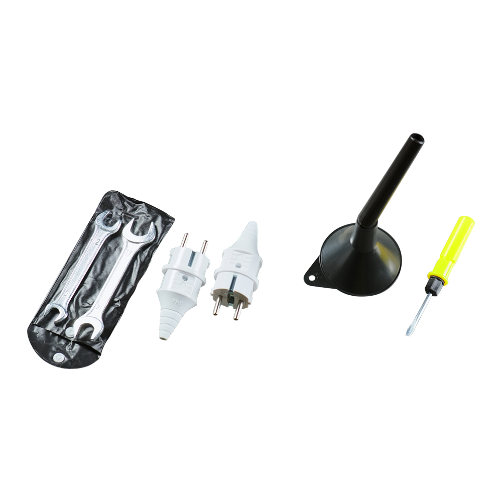 2 вилки 230 В / 16 А , свечной ключ, набор инструментов, воронка для масла |